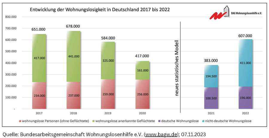 Zum Auftakt ihrer Bundestagung, die vom 8. bis 11. November 2023 in Berlin stattfand, stellte die BAG Wohnungslosenhilfe (BAG W) ihre aktuelle Hochrechnung zur Zahl der wohnungslosen Menschen in Deutschland vor. Die BAG W ist der bundesweite Dachverband der Dienste und Einrichtungen der Wohnungsnotfallhilfen in Deutschland.