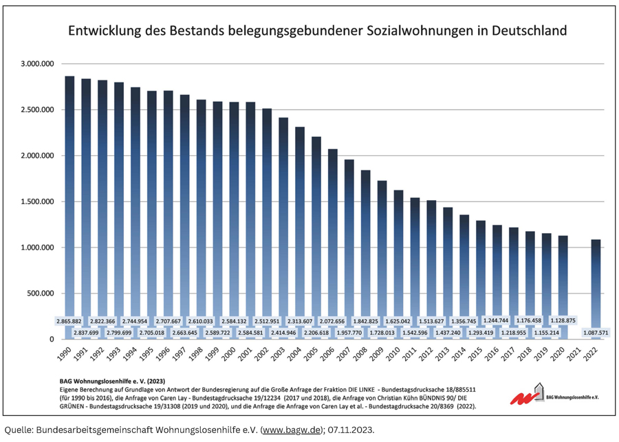 Durch das sukzessive Auslaufen von Sozialbindungen bei gleichzeitig niedrigen Neubauraten sinkt der Anteil der verfügbaren Sozialwohnungen dramatisch – nach Berechnungen der BAG W seit 1989 um ca. 1.801.000 Wohnungen (-62,3 %) auf aktuell ca. 1.088.000 (vgl. Abb. 2). Sie fehlen dauerhaft für eine soziale Wohnraumversorgung.