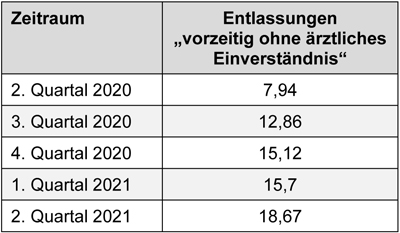 Tab. 1: Zahl der Behandlungsabbrüche (ohne disziplinarische Entlassungen) 2. Quartal 2020 bis 2. Quartal 2021