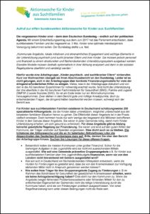 Für Kinder aus suchtbelasteten Familien existieren in Deutschland schätzungsweise 200 spezialisierte Hilfeangebote, die die Kinder dabei unterstützen, möglichst unbeschadet aus der belasteten familiären Situation hervor zu gehen. Die Effektivität dieser Angebote ist in der Praxis vielfach erwiesen. Doch kommen heute nur sehr wenige der insgesamt drei Millionen betroffenen Kinder in den Genuss dieser Angebote. Sie wären in jeder Gemeinde nötig, damit mehr Kinder Unterstützung erhalten, um sich gesund zu entwickeln. Für diese Angebote gibt es bislang keinerlei gesetzliche Regelung zur Finanzierung. Sie waren und sind auf den guten Willen der Kommune, der Träger und/oder auf Spenden angewiesen. Dies droht auch so zu bleiben. Die Initiatoren der Aktionswoche und die an ihr beteiligten Aktivist/innen rufen die Abgeordneten des Deutschen Bundestages dazu auf: Bitte, denken Sie über den Bericht der Arbeitsgruppe hinaus. Suchen Sie Lösungen für diese offenen Fragen: