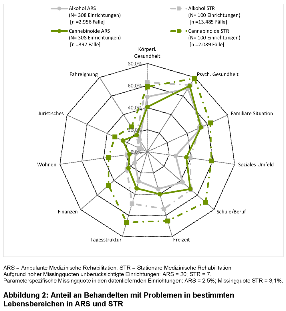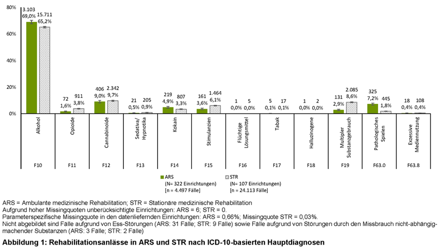 Die Auswertungen konzentrieren sich auf eine Gegenüberstellung von ARS- und STR-Fällen aufgrund von alkohol- bzw. cannabinoidbezogenen Störungen, wobei die Klassifikation der zu Grunde liegenden Störungen gemäß der Internationalen statistischen Klassifikation der Krankheiten und verwandter Gesundheitsprobleme (ICD-10) erfolgt (Dilling et al., 2015). Hierbei werden sowohl Fälle mit Abhängigkeitssyndrom als auch Fälle mit missbräuchlichem Konsum der jeweiligen Substanzen berücksichtigt, wobei DSHS-Auswertungen beide Ausprägungen nicht differenzieren, sondern gemeinsam berichten. Die Schwerpunktsetzung auf Alkohol- (ICD-10 F10) und Cannabinoidkonsumstörungen (ICD-10 F12) ist mit ihrer empirischen Relevanz in ARS und STR begründet.