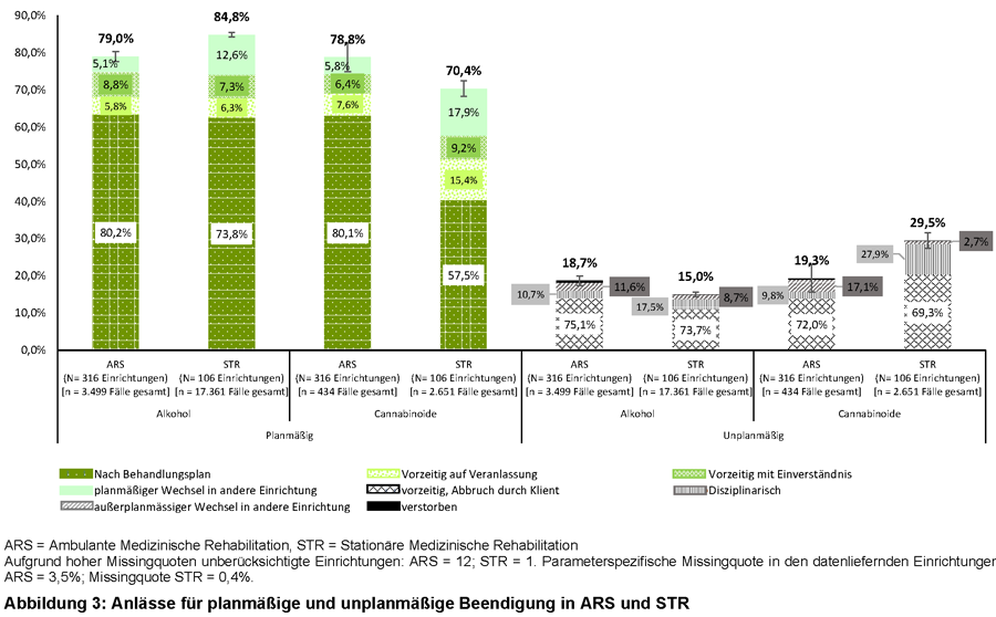 Betrachtet man die Anlässe einer planmäßigen Beendigung, so kam es in ARS jeweils häufiger als in STR zur Beendigung nach Behandlungsplan (alkoholbezogene Störungen 80,2 % vs. 73,8 %; p = 0,0003 | cannabinoidbezogene Störungen 80,1 % vs. 57,5 %; p < 0,0001) und seltener zu planmäßigen Wechseln in andere Einrichtungen (alkoholbezogene Störungen 5,1 % vs. 12,6 %; p < 0,0001 | cannabinoidbezogene Störungen 5,8 % vs. 17,9 %; p < 0,0001). Bei Entwöhnungsbehandlungen aufgrund von alkoholbezogenen Störungen fanden sich in ARS zudem häufiger vorzeitige Beendigungen mit ärztlichem / therapeutischem Einverständnis (8,8 % vs. 7,3 %; p = 0,008) und bei cannabinoidbezogenen Störungen seltener Beendigungen auf ärztliche / therapeutische Veranlassung (7,6 % vs. 15,4 %; p = 0,0003).