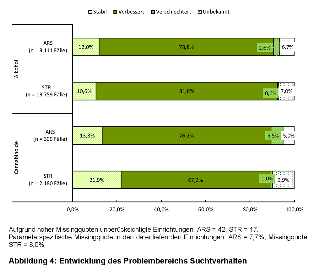 Da die Daten die Situation unmittelbar zum Behandlungsende abbilden, besteht keine Rückschlussmöglichkeit, ob sich die für STR beobachtete deutlich stärkere Konsummengenreduktion nachhaltig verstetigt. Es ist anzunehmen, dass bei stationären Entwöhnungsbehandlungen ein erhöhtes Rückfallrisiko besteht, sobald die Betroffenen in ihrer regulären Lebenswelt wieder erleichterten „Substanzzugriff“ haben. So geht der Katamnesebericht des Fachverbandes Sucht für das Datenjahr 2018 davon aus, dass die Hälfte der Personen, die eine ambulante Entwöhnungsbehandlung durchlaufen haben – davon 79,2 % aufgrund von Alkohol- und 6,4 % aufgrund von Cannabinoidkonsumstörungen – ein Jahr nach deren Abschluss gemäß DGSS 4-Standard (also ggf. nach Rückfall) abstinent war (Becker et al., 2021). Im Bereich der stationären Entwöhnungsbehandlung galt dies im Datenjahr 2020 aber nur für zwei Fünftel der Personen, die aufgrund von Alkoholkonsumstörungen behandelt worden waren (Bachmeier et al., 2023), bzw. für ein Fünftel der Personen, die aufgrund von Cannabinoidkonsumstörungen behandelt worden waren (Kemmann et al., 2023). Dies unterstreicht implizit die Bedeutung, die einer adäquaten Rehabilitations-Nachsorge (Deutsche Rentenversicherung, 2015) insbesondere nach einer stationären Entwöhnungsbehandlung zukommt.