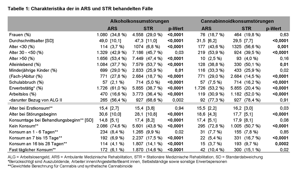 Die aufgrund von alkohol- bzw. cannabinoidbezogenen Störungen behandelte ARS-Klientel unterschied sich hinsichtlich soziodemographischer Charakteristika systematisch von der STR-Klientel (siehe Tabelle 1). Bei beiden Konsumstörungen war die ARS-Klientel im Mittel älter und es fand sich ein geringerer Anteil an unter 30-Jährigen. Zudem lebte die ARS-Klientel jeweils seltener allein, hatte ein höheres Bildungsniveau (Abiturquote höher, Schulabbruchquote geringer) und war häufiger an den Arbeitsmarkt angebunden (Erwerbstätigkeit häufiger, Arbeitslosigkeit seltener). Für Rehabilitationsmaßnahmen aufgrund von alkoholbezogenen Störungen fand sich in ARS zudem ein höherer Anteil an Frauen und an Eltern minderjähriger Kinder.