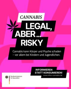 Mit dem Kabinettsbeschluss hat das Bundesgesundheitsministerium eine Kampagne zur Aufklärung von Jugendlichen und jungen Erwachsenen gestartet. Schon während des Gesetzgebungsverfahrens wird damit dem Eindruck entgegengetreten, der Konsum von Cannabis sei ungefährlich. Um die Zielgruppe zu erreichen, läuft die Kampagne hauptsächlich über die digitalen Kanäle des Ministeriums. Aufgehängt ist die Kampagne am scheinbaren Widerspruch von Legalisierung und mit dem Konsum verbundenen Risiken. Zentrales Element wird deshalb der Claim „Legal, aber …“ sein.