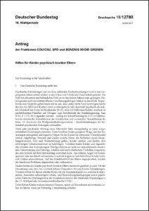Die Bundesregierung wurde unter anderem aufgefordert, eine zeitlich befristete interdisziplinäre Arbeitsgruppe unter Beteiligung des Familien-, des Sozial- und des Gesundheitsministeriums, relevanter Fachverbände und -organisationen sowie weiterer Sachverständiger einzurichten, die einvernehmlich Vorschläge zur Verbesserung der Situation von Kindern und Jugendlichen aus Familien, in denen mindestens ein Elternteil psychisch erkrankt ist, erarbeitet. Dabei soll sie auch auf die Auswirkungen und Möglichkeiten des bereits in Kraft getretenen Präventionsgesetzes eingehen.