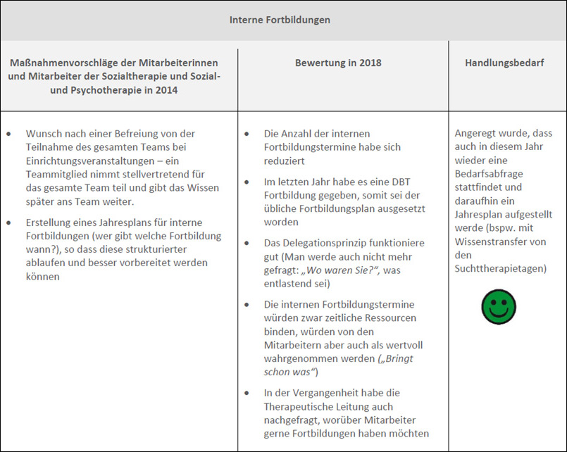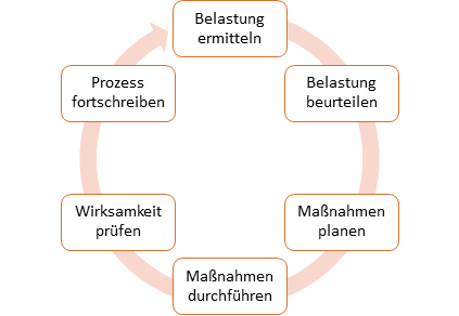 Mit Blick auf das in Teil I des Artikels eingeführte Prozessmodell lässt sich zusammenfassen, dass die AG die Belastungen, die sich in den Befragungsergebnissen und den Workshop-Protokollen zeigen, beurteilt. Sie prüft die Maßnahmenvorschläge und entscheidet, ob sie umgesetzt werden sollen oder nicht. Bei Bedarf werden zusätzliche Maßnahmen geplant. Je nach Sachlage erfolgt die Umsetzung durch die Teilnehmer der AG oder es werden weitere Kolleg/innen einbezogen. Die Wirksamkeit wird, soweit sinnvoll, im Verlauf geprüft. Den Schlusspunkt und gleichzeitig Neustart des Prozesses bildet dann die erneute Gefährdungsanalyse nach ca. drei Jahren.