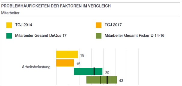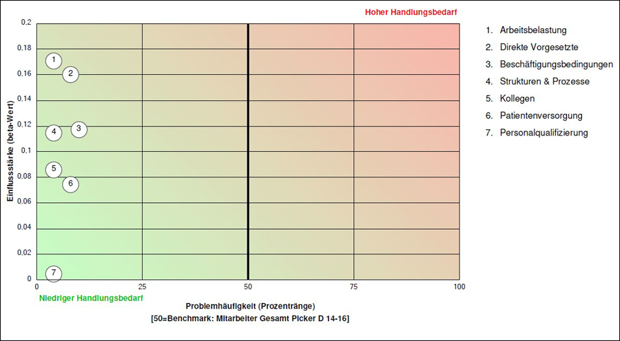 Die Prioritätenmatrix (aus dem Ergebnisbericht 2017 des Picker Instituts für die TGJ) veranschaulicht die Ergebnisse der Befragung auf der Ebene der Faktoren im groben Überblick (Abbildung 6). Auf der y-Achse ist die Einflussstärke der einzelnen Faktoren auf die Gesamtzufriedenheit abgetragen. Die Arbeitsbelastung hat den stärksten Einfluss, es folgt der direkte Vorgesetzte usw.