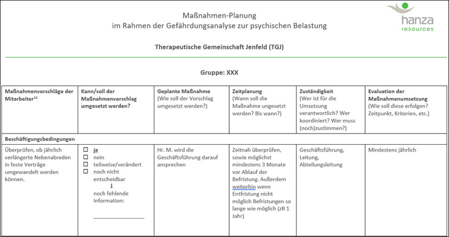 Die Ergebnisse der Mitarbeiterbefragung stehen in der Therapeutischen Gemeinschaft Jenfeld (TGJ) den Mitgliedern der AG Gefährdungsanalyse, der Leitung und dem Betriebsrat in allen Details zur Verfügung. Außerdem erhalten die externen Moderatorinnen der Workshops – die Betriebsärztin (Hanseatisches Zentrum für Arbeitsmedizin hanza) sowie eine auf Gefährdungsanalysen psychischer Belastungen spezialisierte Psychologin (hanza ressources) – die Ergebnisse, um die Workshops vorzubereiten.