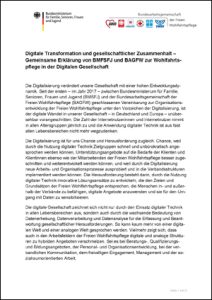 Das Bundesfamilienministerium und die BAGFW bekräftigen und erneuern damit ihre strategische Partnerschaft zur sozialen Gestaltung der digitalen Gesellschaft. Sie sind sich einig, dass die digitalen Kompetenzen, Werkzeuge und Anwendungen sowie darauf bezogene Konzepte und Programme in der Freien Wohlfahrtspflege schnellstens ausgebaut werden müssen. Ziel muss es sein, im Sozialen den Herausforderungen und Risiken der Digitalisierung gerade für von Not und Ausgrenzung bedrohte Menschen zu begegnen. Aber auch, die damit verbundenen neuen Möglichkeiten, Hilfen zu erbringen, besser auszuschöpfen. Gleichzeitig sind sich BMFSFJ und BAGFW darüber einig, dass damit einhergehend auch eine gezielte strategische Gestaltung der digitalen Transformation sowohl auf politischer als auch auf verbandlicher und einrichtungsbezogener Ebene erfolgen muss.