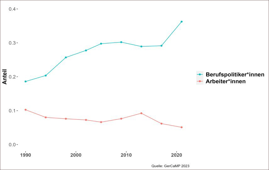 Der Anteil von Arbeiter:innen einerseits sowie von Berufspolitiker:innen andererseits im Deutschen Bundestag im Verlauf der Jahre 1990 bis 2021 Abb.©Lea Elsässer / JGU