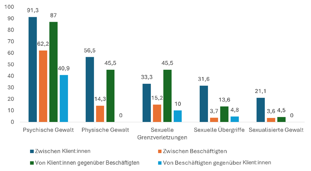 Abbildung 1 verdeutlicht, dass insbesondere zwischen den Klient:innen alle Formen von Gewalt häufig auftreten, wobei psychische Gewalt mit 91,3 Prozent und physische Gewalt mit 56,5 Prozent besonders häufig genannt werden. Auch verletzendes Verhalten von Klient:innen gegenüber Beschäftigten wird häufig berichtet. Hier zeigt sich die gleiche Verteilung: Am häufigsten tritt psychische Gewalt auf (87 Prozent), gefolgt von physischen Übergriffen (45,5 Prozent) sowie sexuellen Grenzverletzungen (45,5 Prozent). Auch hier zeigt sich – ähnlich wie beim verletzenden Verhalten unter Klient:innen (sexuelle Grenzverletzungen 33,3 Prozent, sexuelle Übergriffe 31,6 Prozent und sexualisierte Gewalt 21,1 Prozent) –, dass sexuelle Gewaltformen keineswegs selten sind: 45,5 Prozent der befragten Beschäftigten berichten von sexuellen Grenzverletzungen durch Klient:innen, 13,6 Prozent von sexuellen Übergriffen und 4,5 Prozent von sexualisierter Gewalt.