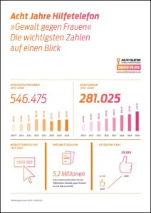 Das Hilfetelefon „Gewalt gegen Frauen“ richtet sich an gewaltbetroffene Frauen, Menschen aus deren sozialem Umfeld und Fachkräfte. Es berät kostenfrei, anonym und vertraulich zu allen Formen von Gewalt – ob Gewalt in der Partnerschaft, Mobbing, Stalking, Zwangsheirat, Vergewaltigung oder Menschenhandel. Über 80 qualifizierte Beraterinnen helfen unter der Telefonnummer 08000 116 016, per E-Mail oder Sofort- bzw. Termin-Chat auf www.hilfetelefon.de. Auf Wunsch vermitteln die Beraterinnen an Unterstützungseinrichtungen vor Ort. Das bundesweite Angebot ist rund um die Uhr an 365 Tagen im Jahr erreichbar. Bei Bedarf kann die Beratung in 17 Fremdsprachen, in Deutscher Gebärdensprache und in Leichter Sprache erfolgen. Seit dem Start im März 2013 wurde insgesamt rund 281.000-mal per Telefon, E-Mail oder Chat beraten. Über 158.000 von Gewalt betroffene Personen haben das niedrigschwellige Angebot genutzt.