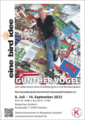 In einer kleinen Stadt in Nordhessen lebt der Grafikdesigner und Wortakrobat Günter Vogel. Seinem Lebenswerk ist in diesem Sommer eine Ausstellung des Kunstvereins in Korbach gewidmet (Bürgerhaus Korbach, 08.07.-16.09.2022). Vogel, in Korbach und überregional als „bird“ bekannt, gewährt Einblicke in seine vielfältige Arbeit aus über 40 Jahren, darunter auch Werbung für Boxsport, Bier oder Bürgermeisterkandidaten.