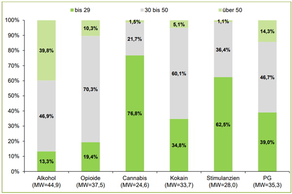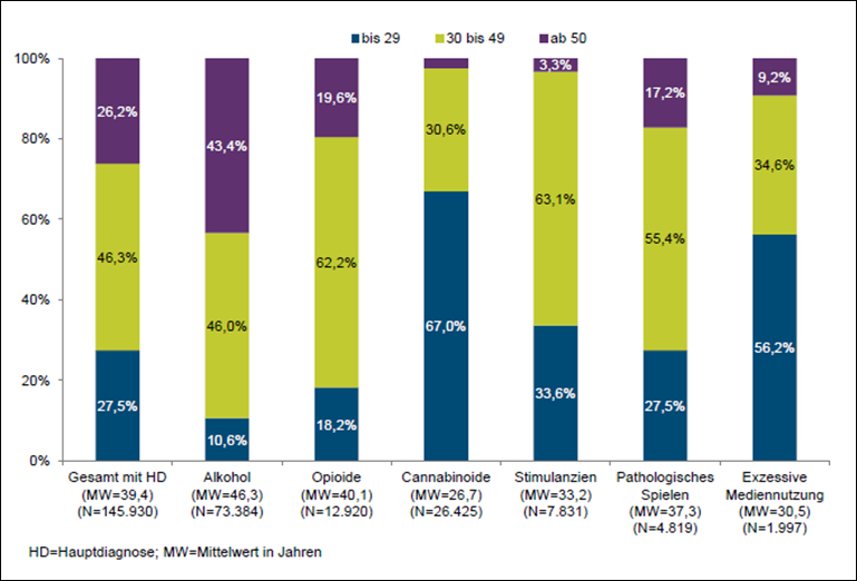 Die Zunahme älterer Menschen mit Abhängigkeitserkrankung zeigt sich im Jahresbericht der Deutschen Suchthilfestatistik (DSHS) deutlich: Allein im Bereich der Opiatabhängigkeit verdoppelte sich der Anteil von Menschen über 50 in den vergangenen Jahren von zehn auf 20 Prozent (siehe zum Vergleich die Jahre 2015/Abb. 1 und 2023/Abb. 2). Laut DSHS liegt das Durchschnittsalter opiatabhängiger Menschen nicht mehr (wie noch 2015) bei Mitte 30, sondern zwischen 40 und 50 Jahren.