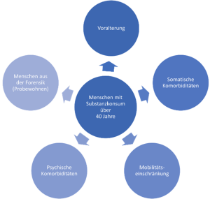 Typische Krankheitsbilder bei dieser Zielgruppe sind nicht nur durch Alterungsprozesse, sondern maßgeblich durch den langjährigen Konsum legaler wie illegaler Substanzen bedingt. In manchen Fällen kommt es zu einer Suchtverlagerung – etwa von Alkohol hin zu exzessivem Essen –, was neue gesundheitliche Probleme nach sich ziehen kann. Der Substanzkonsum kann außerdem die Wahrnehmung des eigenen gesundheitlichen Zustands beeinflussen, sodass Symptome zu spät oder Krankheitsverläufe nicht erkannt werden.