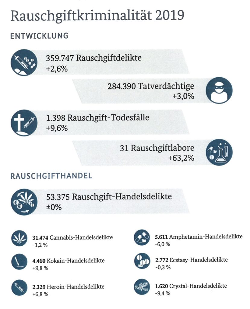 Ob Kokain, Heroin, Amphetamine, Neue Psychoaktive Stoffe (NPS) oder Cannabis: Alle Arten von Drogen werden in Deutschland gehandelt – Tendenz steigend. Seit nunmehr neun Jahren nimmt die Zahl der polizeilich registrierten Rauschgiftdelikte kontinuierlich zu. In dem am 8. September veröffentlichten „Bundeslagebild Rauschgiftkriminalität 2019“ des Bundeskriminalamtes (BKA) ist mit 359.747 Delikten ein Plus von rund 2,6 Prozent gegenüber dem Vorjahr (2018: 350.662) zu verzeichnen.