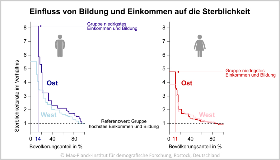 Dass die Sterblichkeit der Männer im Osten höher ist, liegt also daran, dass es dort einen höheren Anteil an Arbeitslosen, an weniger Gebildeten und an Menschen mit geringerem Einkommen gibt. Denn all diese Faktoren erhöhen die Sterblichkeit. Andere in Ost und West unterschiedliche Faktoren, wie etwa die medizinische Infrastruktur, scheinen hingegen eine verschwindende Rolle zu spielen.