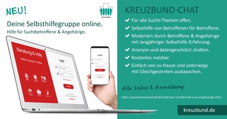 Der Kreuzbund hat schon vor der Corona-Pandemie ein niedrigschwelliges digitales Angebot geschaffen. Seit April 2020 ist der Kreuzbund-Chat auf der Plattform der Caritas Online-Beratung aktiv: www.kreuzbund.de/chat. Er ist ein Angebot für alle Menschen mit Suchtproblemen und auch für die Gruppenmitglieder des Kreuzbundes – alle sind willkommen!