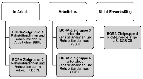 Die BORA-Empfehlungen unterscheiden zunächst zwischen Rehabilitand*innen mit bestehendem Arbeitsverhältnis und Rehabilitanden, die ohne Beschäftigungsverhältnis sind. Besteht ein Arbeitsverhältnis, liegt der Schwerpunkt auf dem Erhalt des Beschäftigungsverhältnisses und der Beseitigung von am Arbeitsplatz existierenden Problemlagen. Hier kann die Zusammenarbeit mit dem Arbeitgeber eine förderliche Funktion einnehmen. Bei arbeitslosen Rehabilitanden steht die Entfaltung einer persönlichen beruflichen Perspektive im Vordergrund. Eine rechtzeitige Kooperation mit den unterschiedlichen Leistungsträgern (bspw. Jobcenter, Agentur für Arbeit) ist dabei zwingend notwendig (vgl. BORA-Empfehlungen 2014, S. 3). Die BORA-Empfehlungen unterscheiden insgesamt fünf Zielgruppen, die in Abbildung 1 im Einzelnen dargestellt sind: