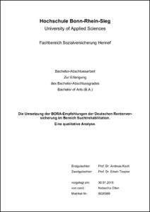 Wegen der großen Bedeutsamkeit der beruflichen (Re-)Integration bei Abhängigkeitserkranken hat die DRV in Kooperation mit den Fachverbänden (buss, fdr, FVS) eine Arbeitsgruppe zur beruflichen Orientierung in der medizinischen Rehabilitation Abhängigkeitserkrankter (BORA) etabliert und als Ergebnis 2014 Empfehlungen zur Stärkung des Erwerbsbezugs veröffentlicht (vgl. BORA-Empfehlungen 2014, S. 2 ff.).