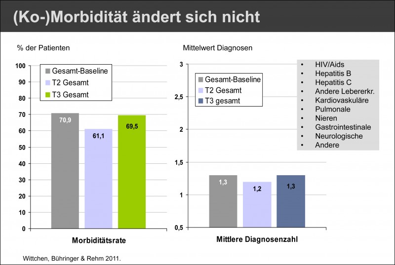 Die psychische Morbidität ist unter Substitution weiterhin stark ausgeprägt. Zu den häufigsten komorbiden Störungen gehören Depression, Angststörungen, Schlafstörungen, Persönlichkeitsstörungen sowie Stress- und psychotische Störungen. Über Substitutionsbehandlung in Haft sind so gut wie keine Daten bekannt.