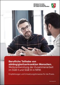 Unter Federführung des Ministeriums für Arbeit, Gesundheit und Soziales des Landes Nordrhein-Westfalen (MAGS) haben fünf sektorenübergreifende und interdisziplinäre Arbeitsgruppen Empfehlungen zur Verbesserung der beruflichen Teilhabe von abhängigkeitserkrankten Menschen entwickelt. Diese wurden im März 2021 in einer Broschüre mit dem Titel „Berufliche Teilhabe von abhängigkeitserkrankten Menschen. Weiterentwicklung der Zusammenarbeit im SGB II und SGB III in NRW. Empfehlungen und Umsetzungshinweise für die Praxis“ veröffentlicht. Die Empfehlungen beziehen sich auf folgende Handlungsfelder: